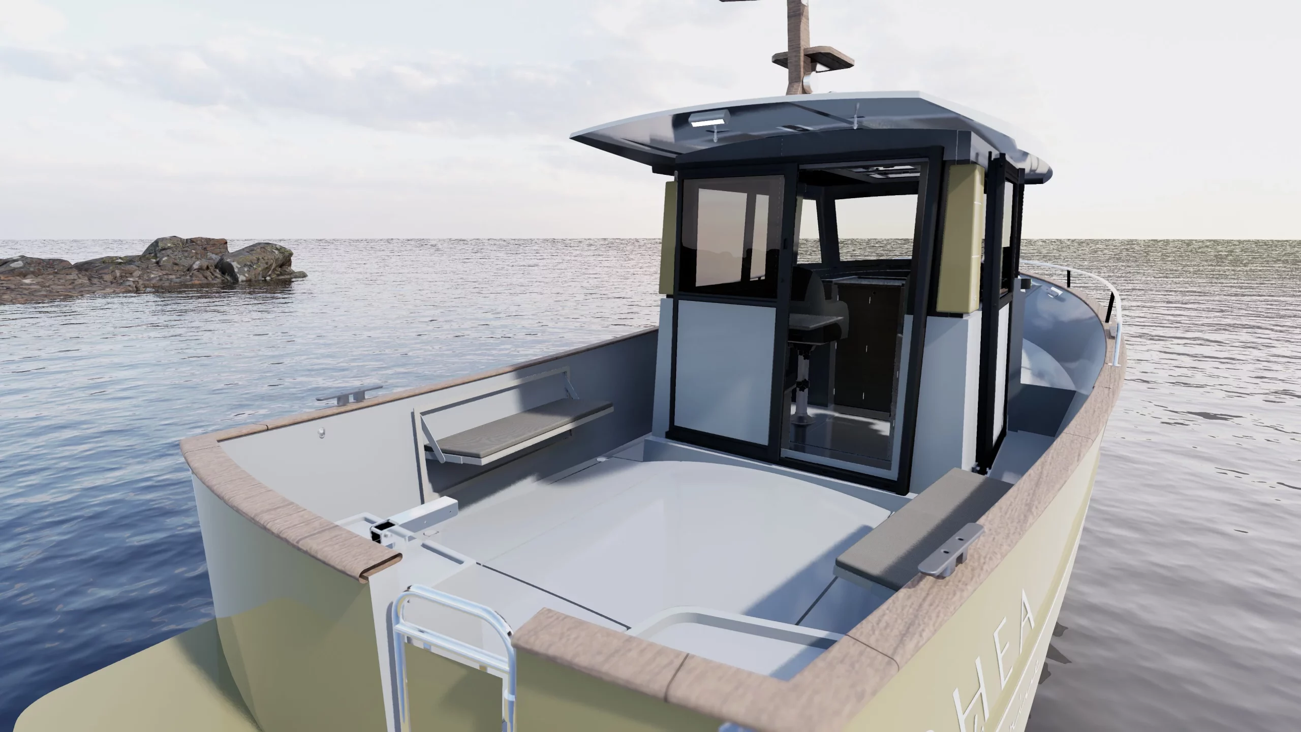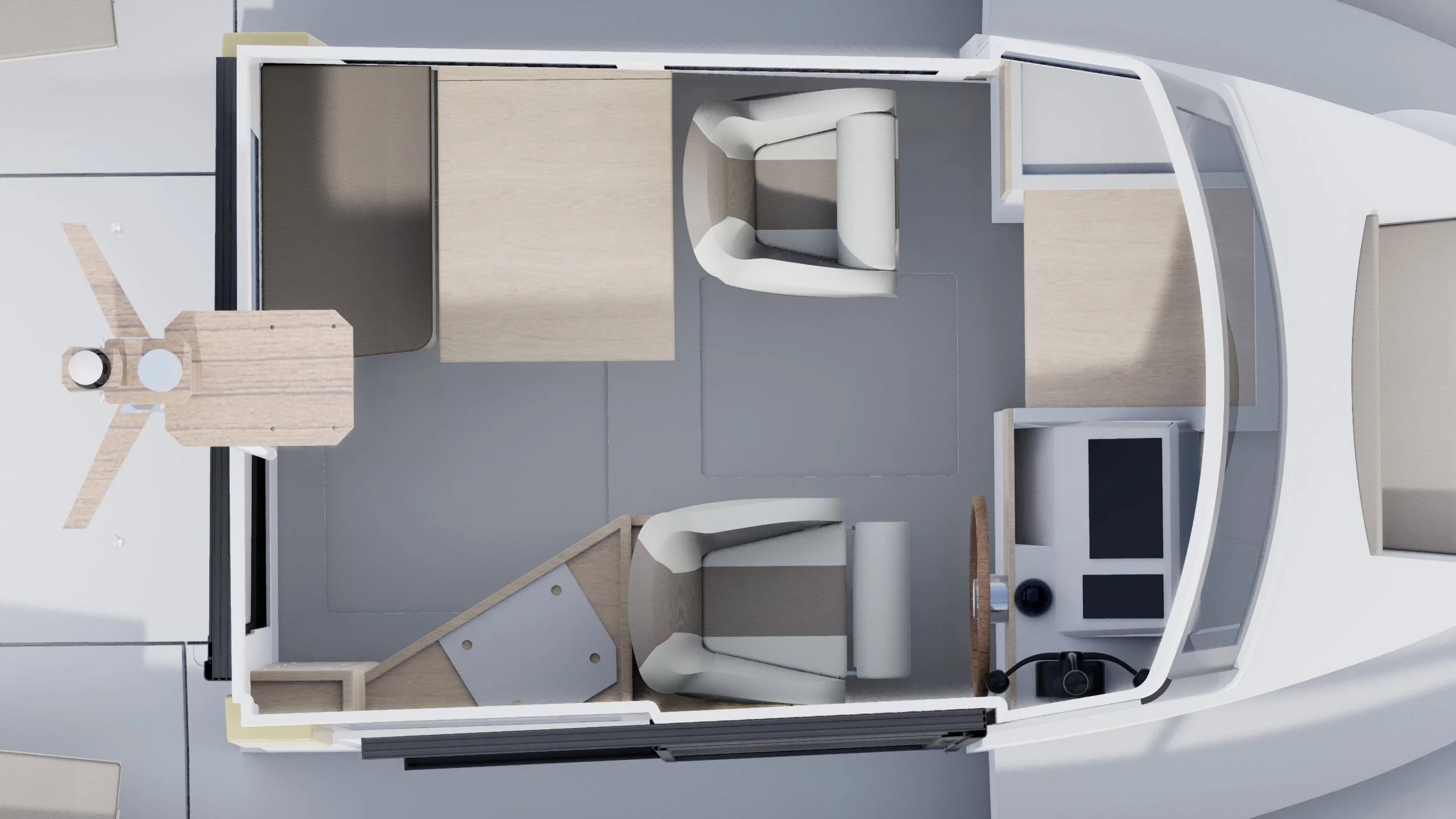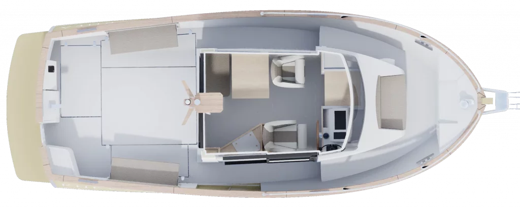 Intérieur en chêne clair massif. Une console rabaissée offrant une meilleure visibilité vers l’avant en rabaissant la console. Plafond vaigré bi-ton. Augmentation du nombre de points lumineux LEDS dans la timonerie ( 4 au lieu d’1 )