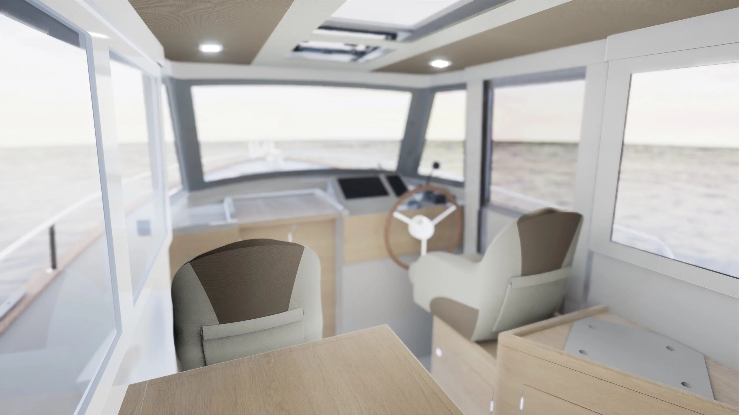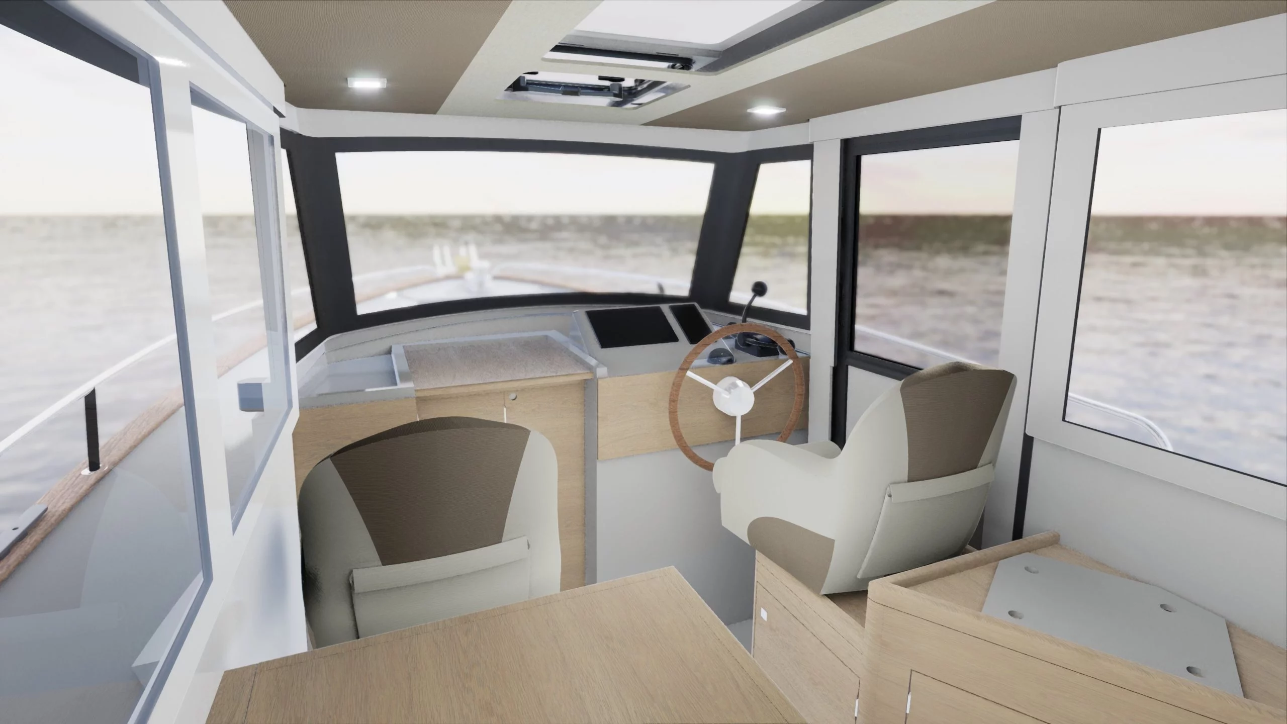 Solid light oak interior . A lowered console provides improved forward visibility. Two-tone panelled ceiling . Increased number of LED lights in the wheelhouse (4 instead of 1).
